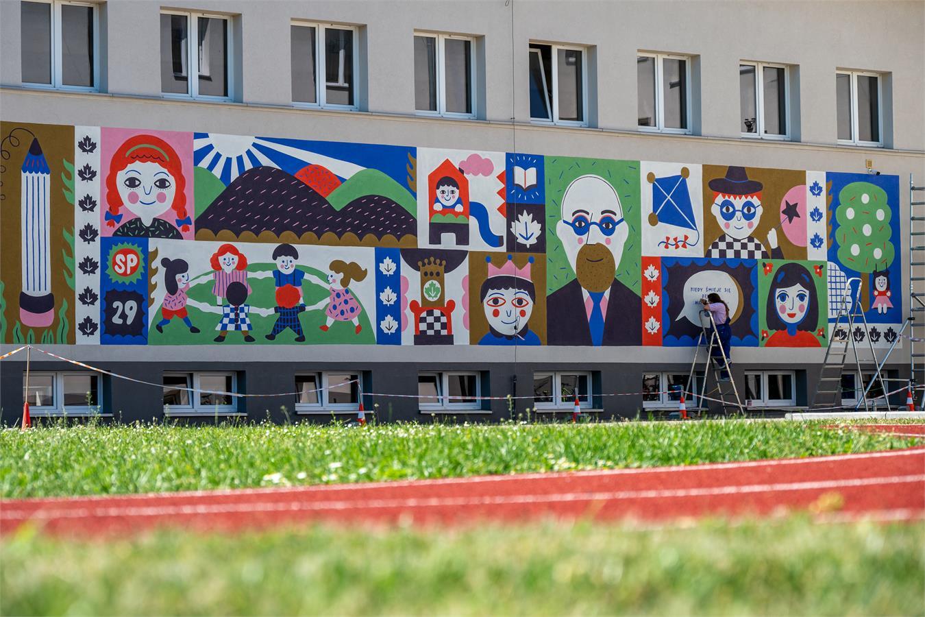 Finał dzisiejszego spaceru to ulica Czereśniowa 20 i ściana Szkoły Podstawowej nr 29. Mural „Z Korczakiem za rękę” to nie tylko praca o relacji młodych z tradycją i mądrością. To przede wszystkim obraz o odpowiedzialności za to, co dopiero się zaczyna, lekcja przekazana tak plastycznie, by młodzi i dorośli słyszeli ją równie wyraźnie.