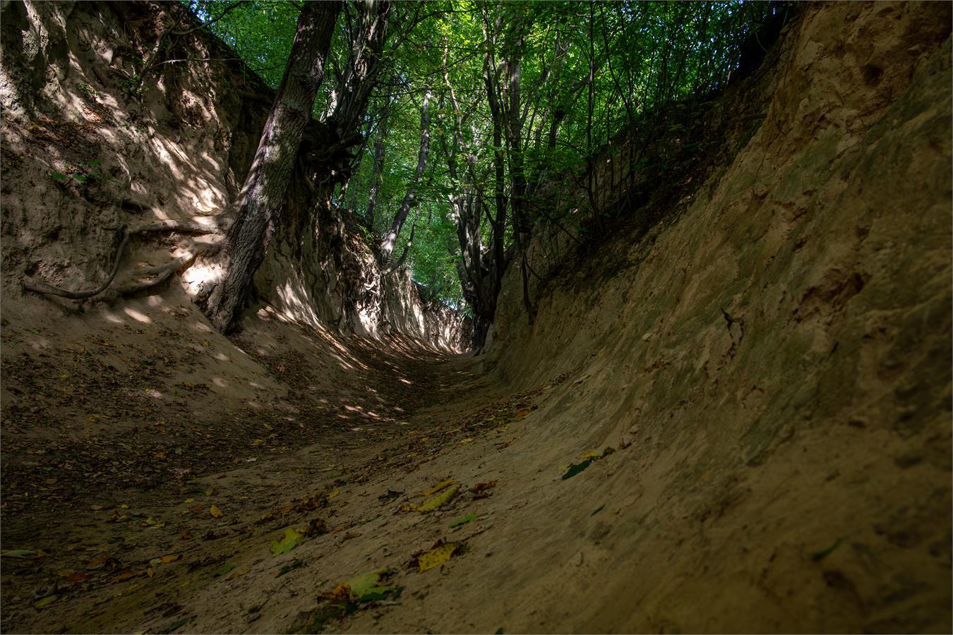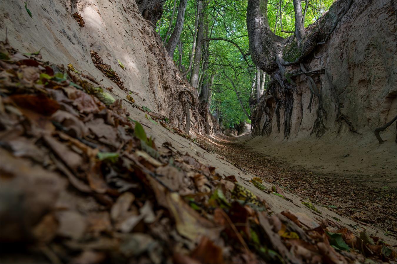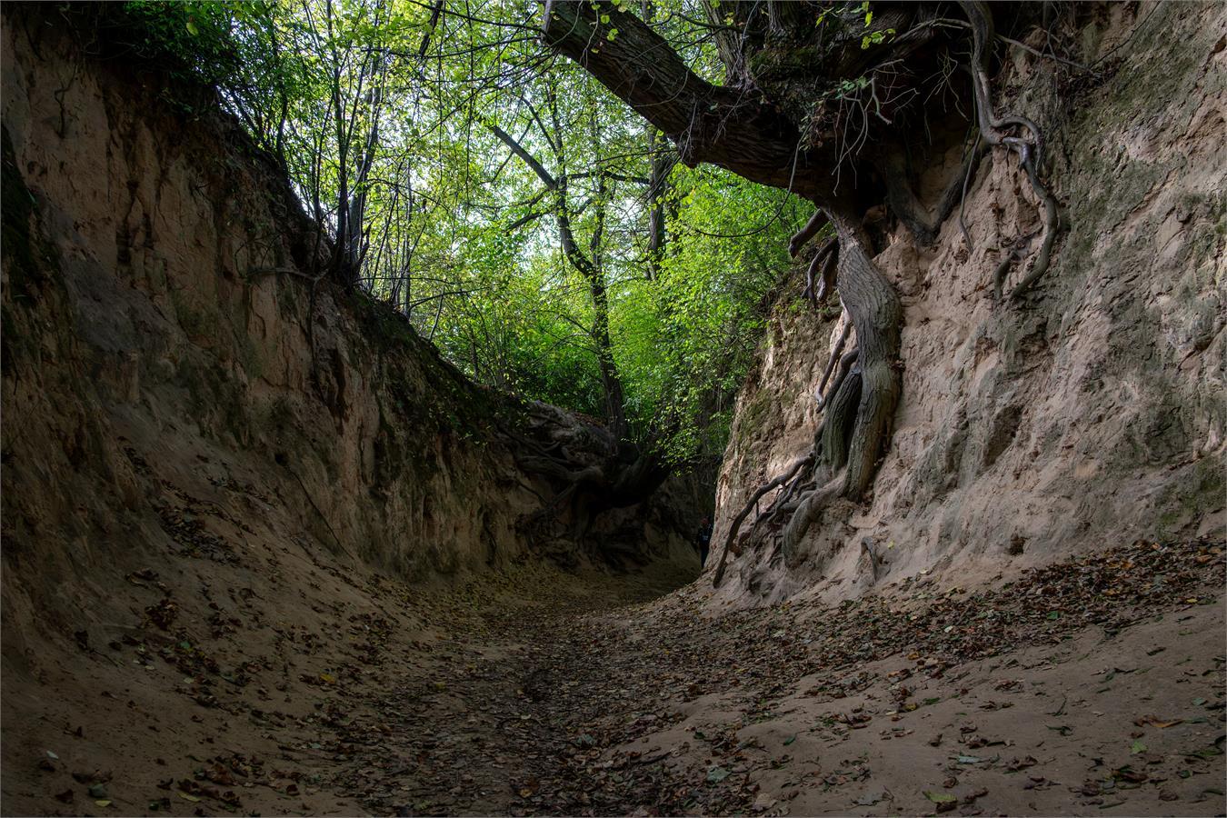 Idę do Wąwozu Korzeniowego Dołu i nagle zmienia się skala. Ściany wyrastają na kilka metrów, korzenie zwisają jak rzeźby, a światło wpada w nieregularnych pasmach. To nie jest tylko natura. Setki lat temu wozy wyjeżdżały tędy z miasta, rozcinając miękki less. Deszcz pogłębiał koleiny, a czas robił resztę. Każdy przejazd zostawiał ślad. Dziś widać efekt pracy ludzi i przyrody działających razem przez pokolenia.