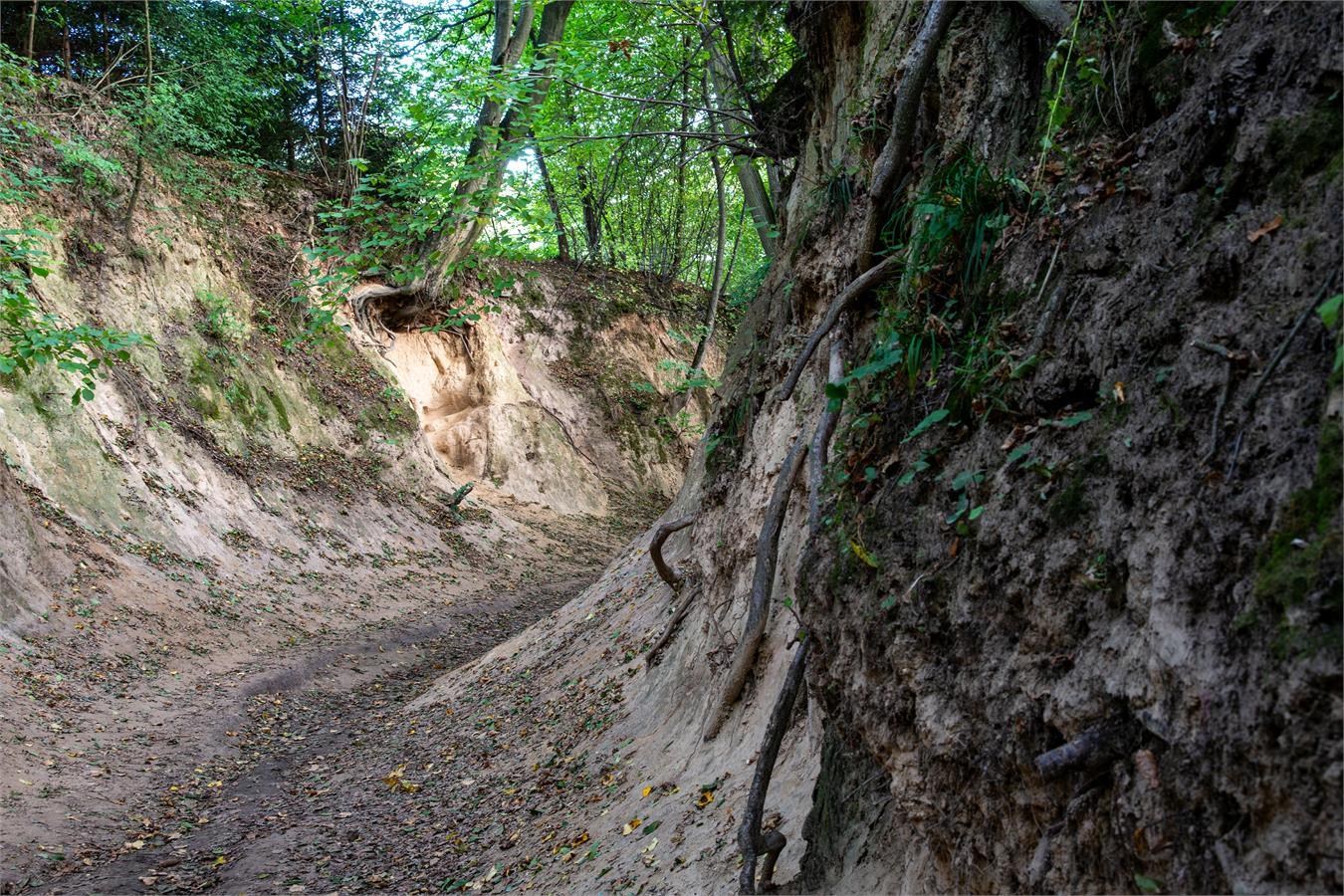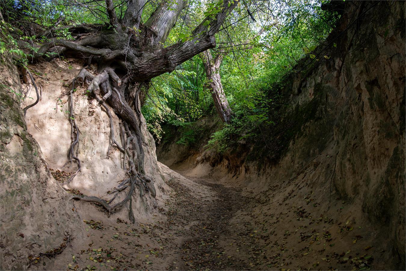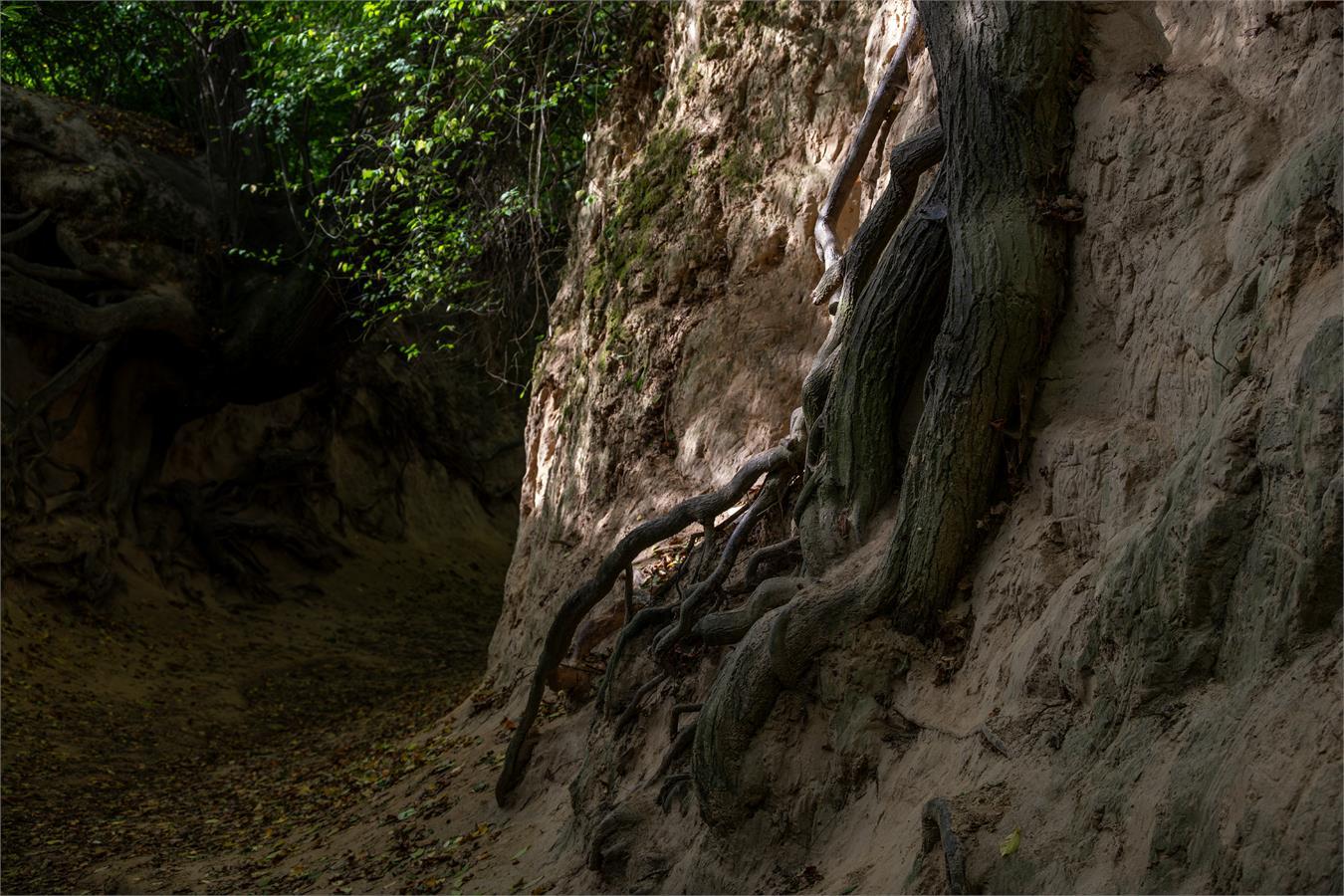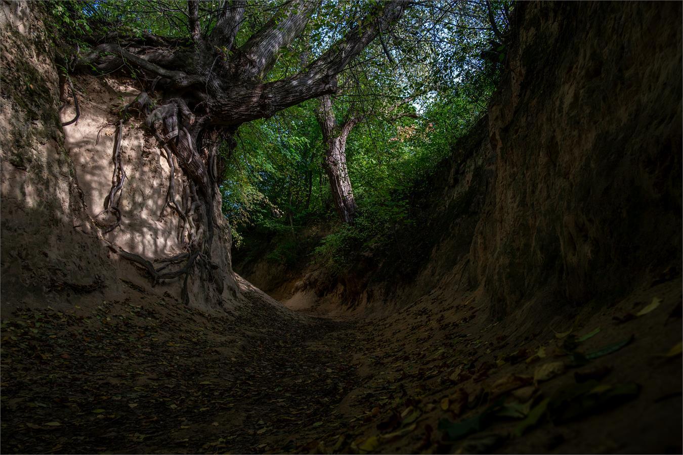 Idę do Wąwozu Korzeniowego Dołu i nagle zmienia się skala. Ściany wyrastają na kilka metrów, korzenie zwisają jak rzeźby, a światło wpada w nieregularnych pasmach. To nie jest tylko natura. Setki lat temu wozy wyjeżdżały tędy z miasta, rozcinając miękki less. Deszcz pogłębiał koleiny, a czas robił resztę. Każdy przejazd zostawiał ślad. Dziś widać efekt pracy ludzi i przyrody działających razem przez pokolenia.