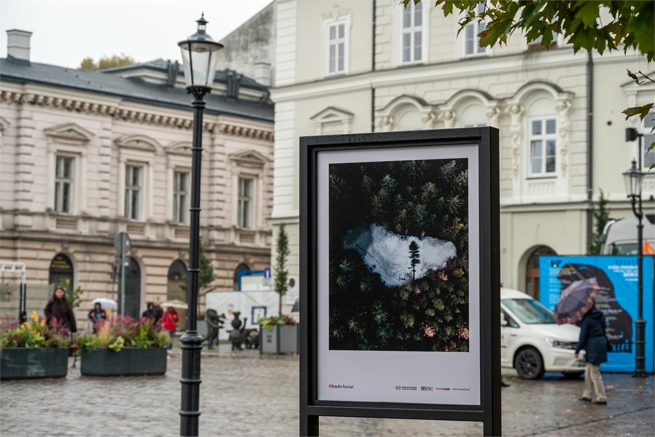 Spacer po festiwalu nie ma jednej trasy. Każdy układa ją po swojemu. Moja zaczęła się na Placu Wojska Polskiego. Plenerowa wystawa Bartłomieja Machula „Z nieba na ziemię – minimalistyczne odkrycia”, oparta na lotniczych kadrach, zamieniła znane fragmenty miasta w abstrakcyjne układy geometrii i koloru. Proste środki, bardzo dobry efekt.